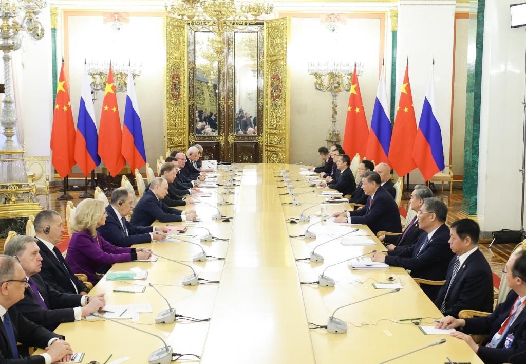 Chinese President Xi Jinping and Russian President Vladimir Putin hold small-group talks at the Kremlin in Moscow, Russia, May 8, 2025. Xi held talks here on Thursday with Putin. (Xinhua/Wang Ye)
