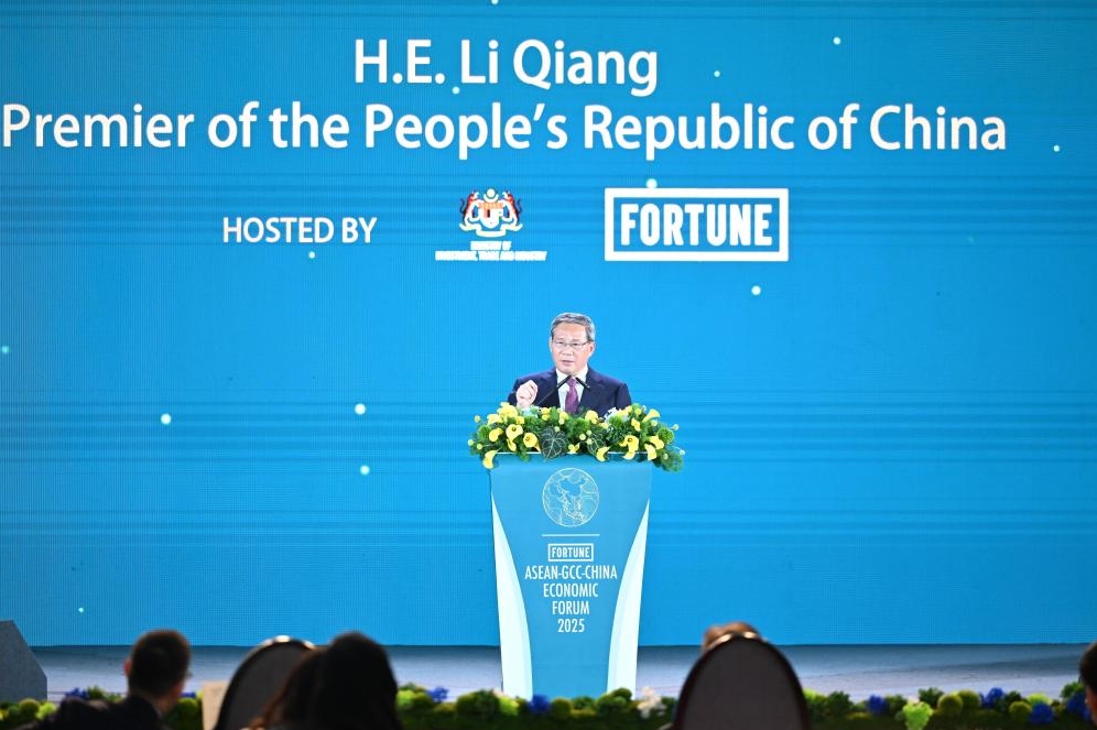 Chinese Premier Li Qiang addresses the opening ceremony of the ASEAN (the Association of Southeast Asian Nations)-China-GCC (the Gulf Cooperation Council) Economic Forum 2025 in Kuala Lumpur, Malaysia, May 27, 2025. Malaysian Prime Minister Anwar Ibrahim and Vietnamese Prime Minister Pham Minh Chinh also attended the event. (Xinhua/Li Xiang)