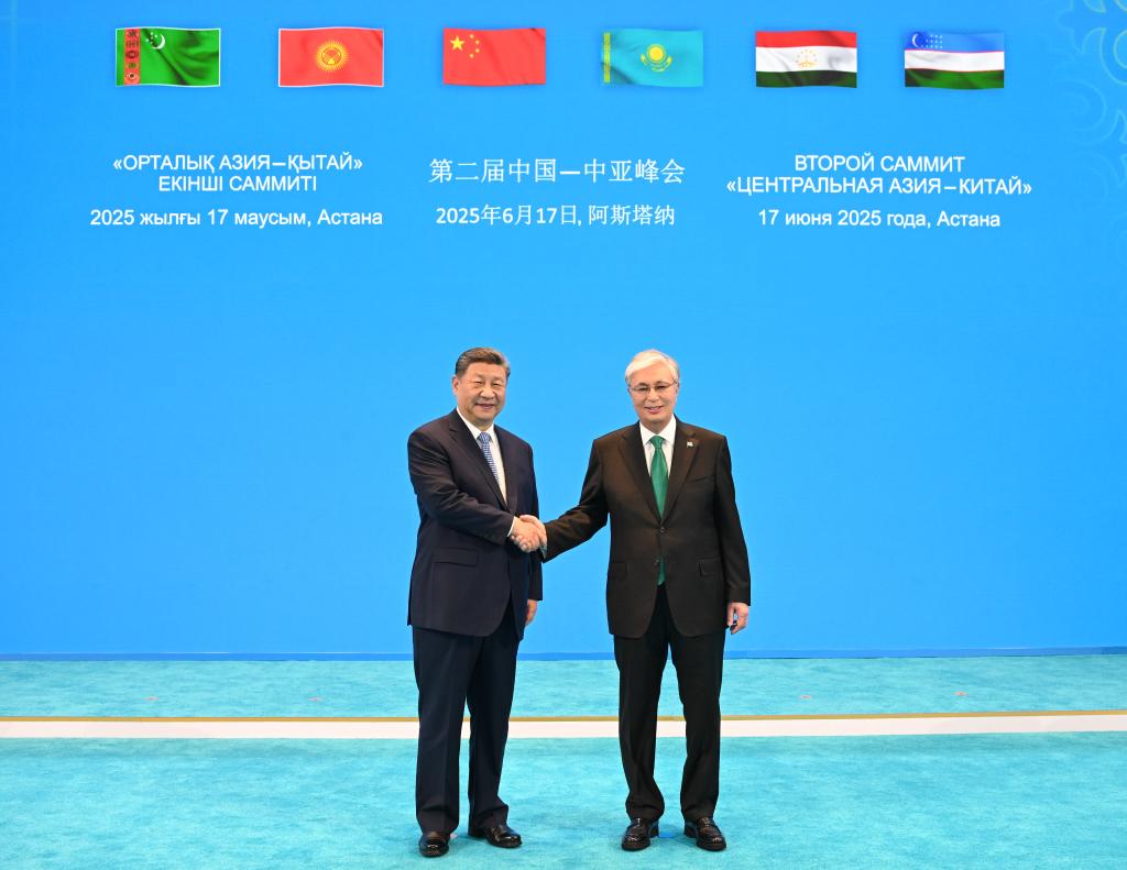 Chinese President Xi Jinping shakes hands with Kazakh President Kassym-Jomart Tokayev in Astana, Kazakhstan, June 17, 2025. The second China-Central Asia Summit was held in Astana on Tuesday. Tokayev chaired the summit. Xi, Kyrgyz President Sadyr Japarov, Tajik President Emomali Rahmon, Turkmen President Serdar Berdimuhamedov and Uzbek President Shavkat Mirziyoyev attended the summit. (Xinhua/Xie Huanchi)