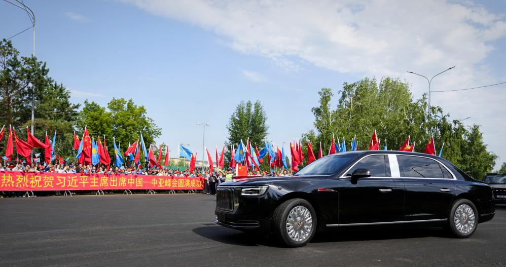 On the way to the airport, representatives of Chinese enterprises and Chinese overseas students lined the streets, waving the national flags of China and Kazakhstan to warmly congratulate Xi on his successful attendance at the summit. (Xinhua/Bi Xiaoyang)