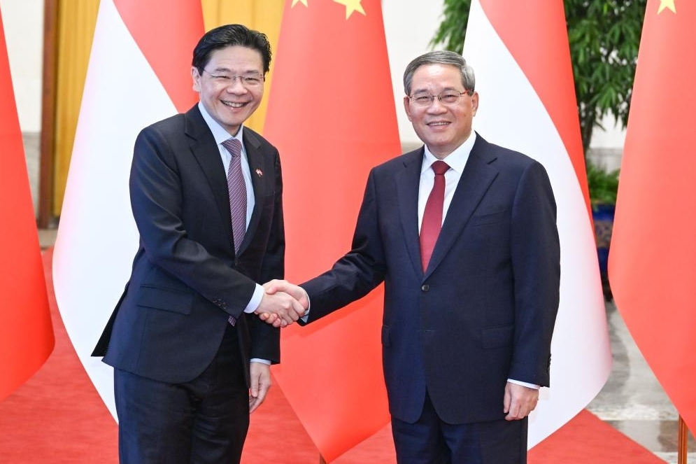 Chinese Premier Li Qiang held talks with Singaporean Prime Minister Lawrence Wong, who is on an official visit to China, in Beijing on Monday.