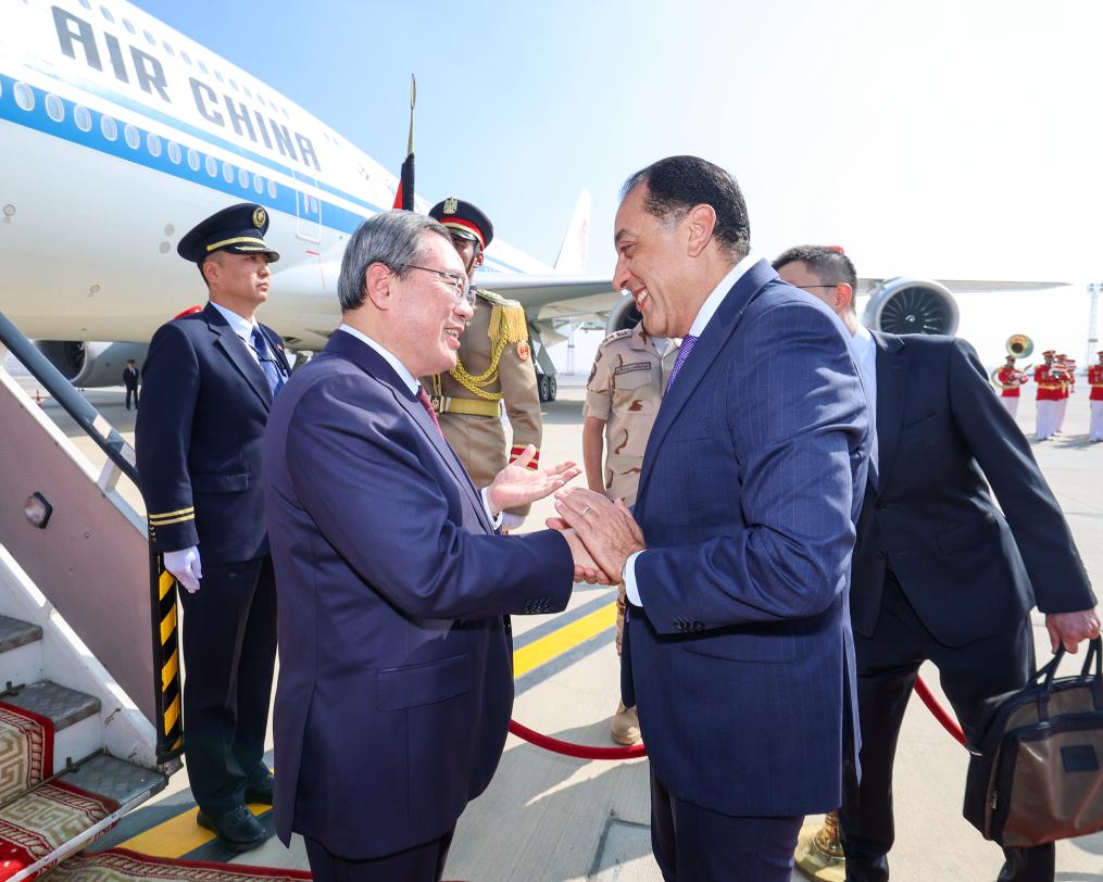 Chinese Premier Li Qiang arrives at Cairo International Airport in Cairo, Egypt, July 9, 2025. Li arrived in the Egyptian capital on Wednesday for an official visit to the Middle East country, at the invitation of his Egyptian counterpart, Mostafa Kamal Madbouly. The Egyptian prime minister and senior government officials welcomed Li at the airport and held a welcome ceremony in his honor. (Xinhua/Liu Bin)
