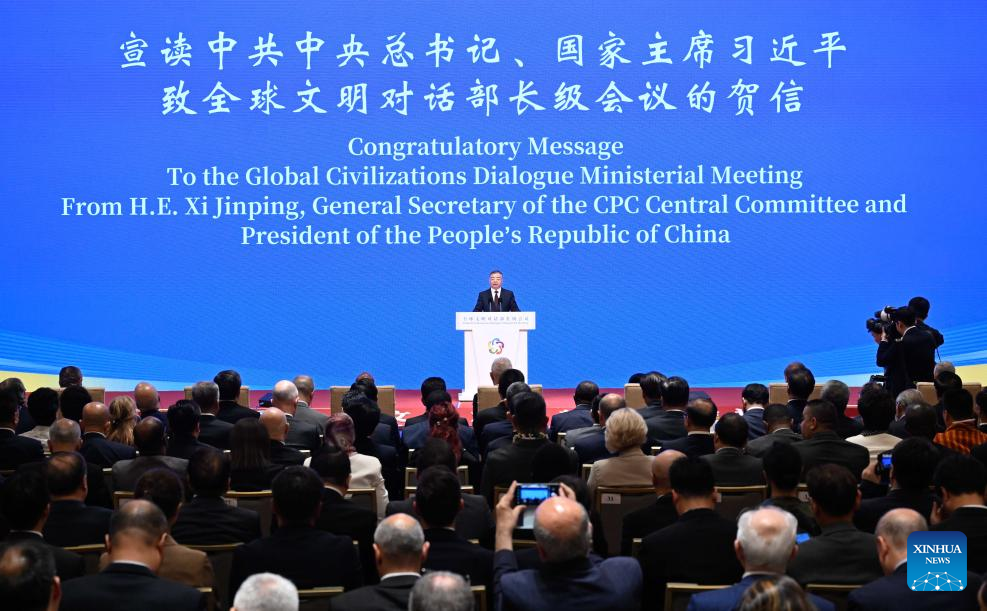 Li Shulei, a member of the Political Bureau of the Communist Party of China (CPC) Central Committee and head of the Publicity Department of the CPC Central Committee, reads out a congratulatory letter from Chinese President Xi Jinping at the opening ceremony of the Global Civilizations Dialogue Ministerial Meeting in Beijing, capital of China, July 10, 2025. The Global Civilizations Dialogue Ministerial Meeting opened here on Thursday. (Xinhua/Shen Hong)