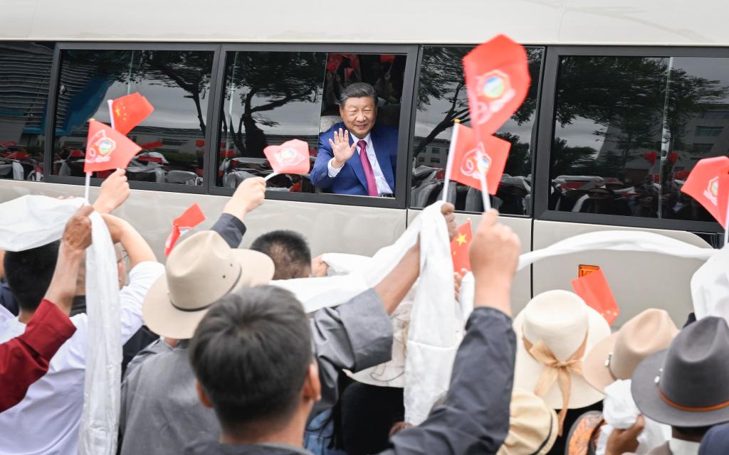 Chinese President Xi Jinping, also general secretary of the Communist Party of China Central Committee and chairman of the Central Military Commission, opens the car window and waves to people in Lhasa, southwest China's Xizang Autonomous Region, Aug. 20, 2025. Xi, who leads a central delegation, arrived in Lhasa, capital of Xizang, on Wednesday to attend activities in celebration of the region's 60th founding anniversary. (Xinhua/Shen Hong)