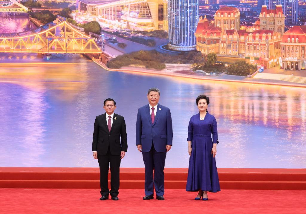 Chinese President Xi Jinping and his wife, Peng Liyuan, pose for a group photo with Min Aung Hlaing, acting president of Myanmar, at the Meijiang Convention and Exhibition Center in Tianjin, north China, Aug. 31, 2025. Xi and Peng on Sunday hosted a banquet in China's port city of Tianjin to welcome international guests who are here to attend the Shanghai Cooperation Organization (SCO) Summit 2025. (Xinhua/Huang Jingwen)