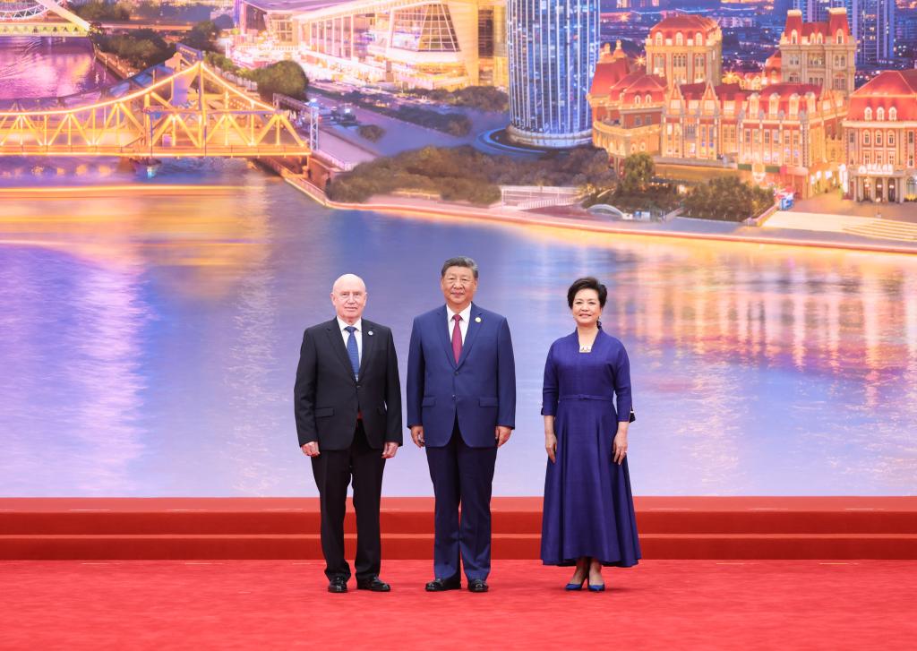 Chinese President Xi Jinping and his wife, Peng Liyuan, pose for a group photo with Secretary General of the Commonwealth of Independent States Sergey Lebedev at the Meijiang Convention and Exhibition Center in Tianjin, north China, Aug. 31, 2025. Xi and Peng on Sunday hosted a banquet in China's port city of Tianjin to welcome international guests who are here to attend the Shanghai Cooperation Organization (SCO) Summit 2025. (Xinhua/Ding Haitao)
