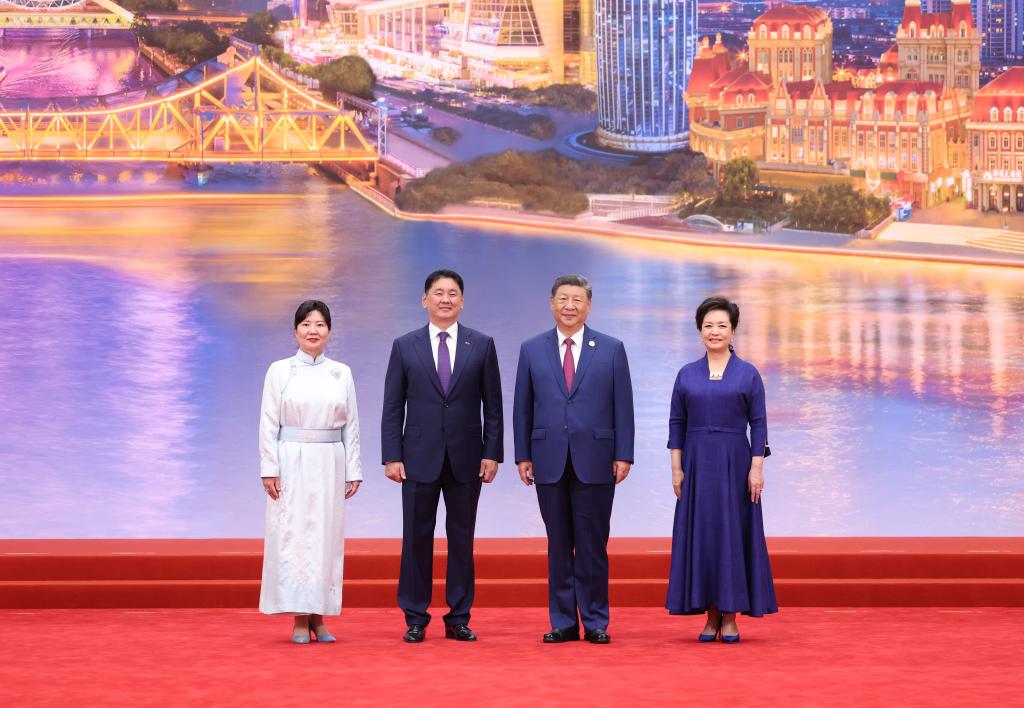 Chinese President Xi Jinping and his wife, Peng Liyuan, pose for a group photo with Mongolian President Ukhnaa Khurelsukh and his wife at the Meijiang Convention and Exhibition Center in Tianjin, north China, Aug. 31, 2025. Xi and Peng on Sunday hosted a banquet in China's port city of Tianjin to welcome international guests who are here to attend the Shanghai Cooperation Organization (SCO) Summit 2025. (Xinhua/Huang Jingwen)