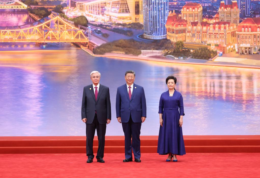 Chinese President Xi Jinping and his wife, Peng Liyuan, pose for a group photo with Kazakh President Kassym-Jomart Tokayev at the Meijiang Convention and Exhibition Center in Tianjin, north China, Aug. 31, 2025. Xi and Peng on Sunday hosted a banquet in China's port city of Tianjin to welcome international guests who are here to attend the Shanghai Cooperation Organization (SCO) Summit 2025. (Xinhua/Huang Jingwen)