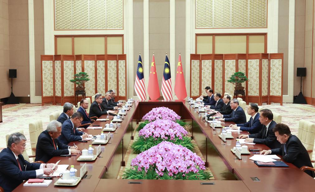 Chinese Premier Li Qiang meets with Malaysian Prime Minister Anwar Ibrahim at the Diaoyutai State Guesthouse in Beijing, capital of China, Sept. 2, 2025. Anwar is in China for the Shanghai Cooperation Organization Summit 2025, as well as commemorations marking the 80th anniversary of the victory in the Chinese People's War of Resistance against Japanese Aggression and the World Anti-Fascist War. (Xinhua/Wang Ye)