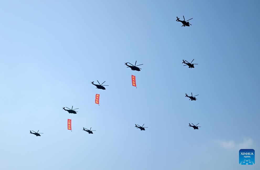 A flag-guarding echelon flies over Tian'anmen Square during a grand gathering to commemorate the 80th anniversary of the victory in the Chinese People's War of Resistance against Japanese Aggression and the World Anti-Fascist War in Beijing, capital of China, Sept. 3, 2025. (Xinhua/Xia Yifang)