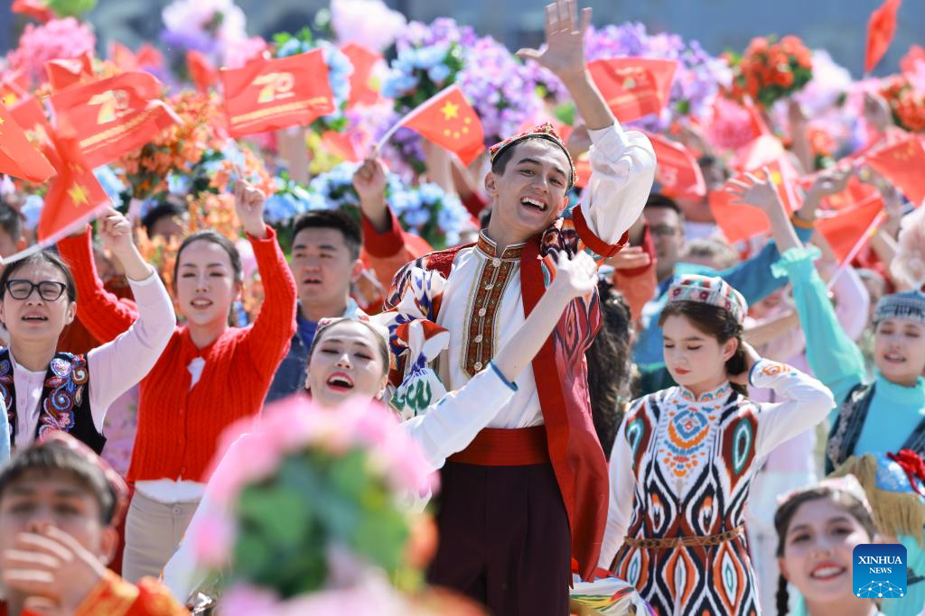 Chinese President Xi Jinping, also general secretary of the Communist Party of China Central Committee and chairman of the Central Military Commission, and the delegation receive a warm welcome from people of various ethnic groups at the Urumqi Tianshan International Airport and in Urumqi's city proper, northwest China's Xinjiang Uygur Autonomous Region, Sept. 23, 2025. Xi, who leads a central delegation, arrived in Urumqi, capital of Xinjiang Uygur Autonomous Region, on Tuesday to attend activities marking the region's 70th founding anniversary. (Xinhua/Ding Lin)