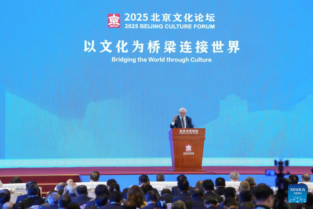 Former French Prime Minister Jean-Pierre Raffarin delivers a speech titled "Bridging the World through Culture" during the 2025 Beijing Culture Forum in Beijing, capital of China, Sept. 23, 2025. The 2025 Beijing Culture Forum opened here on Tuesday, drawing participants from home and abroad to discuss the integrated development of culture and technology. (Xinhua/Ju Huanzong)