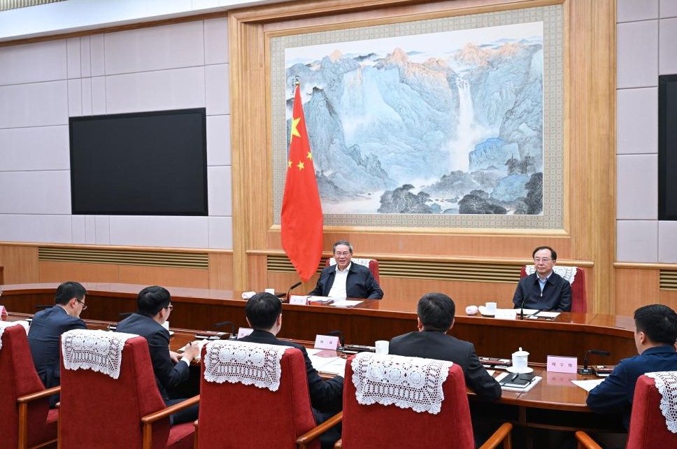 Chinese Premier Li Qiang, also a member of the Standing Committee of the Political Bureau of the Communist Party of China (CPC) Central Committee, presides over a symposium on the economic situation, and listens to opinions and suggestions from experts and entrepreneurs on the country's economy and relevant work, Oct. 14, 2025. (Xinhua/Rao Aimin)