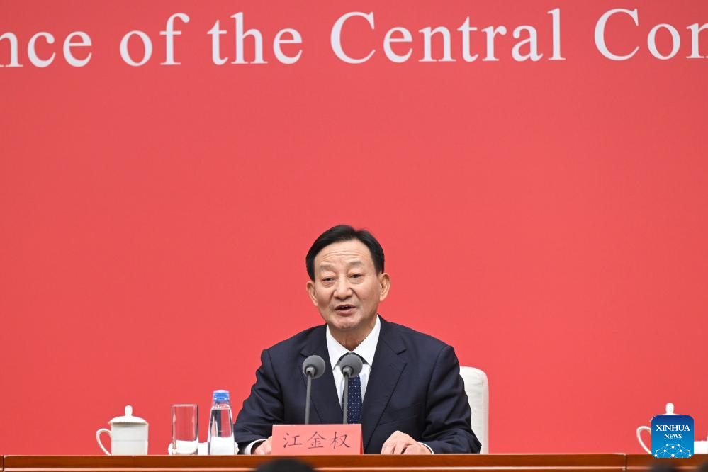 Jiang Jinquan, director of the Policy Research Office of the Communist Party of China (CPC) Central Committee, speaks at a press conference held by the CPC Central Committee on the guiding principles from the fourth plenary session of the 20th CPC Central Committee on Oct. 24, 2025. (Xinhua/Jin Liangkuai)