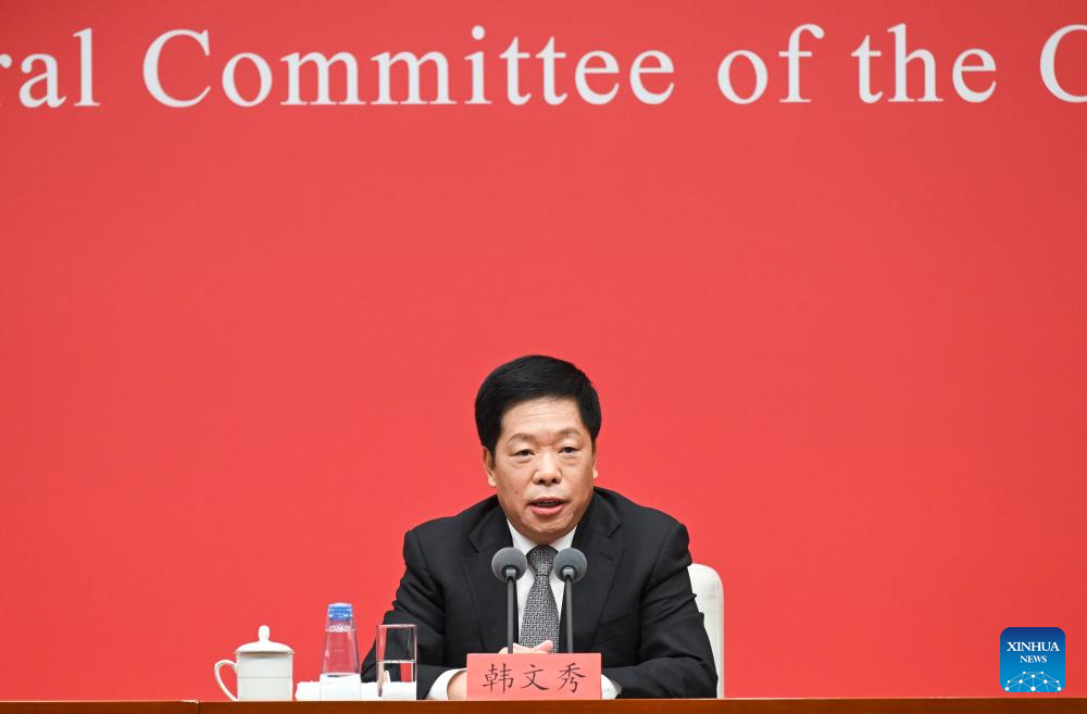 Han Wenxiu, executive deputy director of the Office of the Central Committee for Financial and Economic Affairs, speaks at a press conference held by the Communist Party of China (CPC) Central Committee on the guiding principles from the fourth plenary session of the 20th CPC Central Committee on Oct. 24, 2025. (Xinhua/Jin Liangkuai)