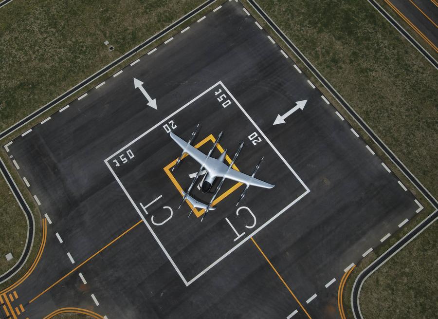 An aerial drone photo taken on July 22, 2025 shows the V2000CG CarryAll, a tonne-class electric vertical takeoff and landing (eVTOL) aircraft on the apron in Kunshan, east China's Jiangsu Province. (Xinhua/Fang Zhe)