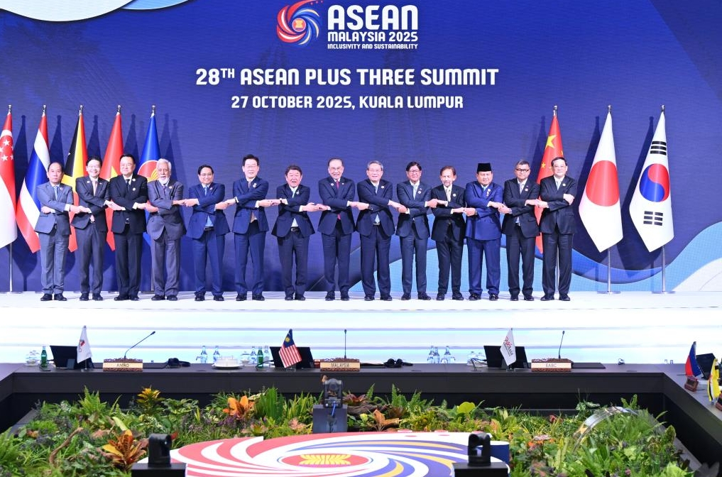 Chinese Premier Li Qiang poses for a group photo while attending the 28th ASEAN Plus Three Summit in Kuala Lumpur, Malaysia, Oct. 27, 2025. (Xinhua/Li Xiang)