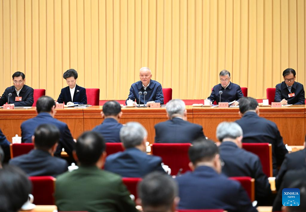 Cai Qi, a member of the Standing Committee of the Political Bureau of the Communist Party of China (CPC) Central Committee and a member of the CPC Central Committee Secretariat, speaks at a mobilization meeting on a lecture program for promoting the guiding principles from the fourth plenary session of the 20th CPC Central Committee in Beijing, capital of China, Oct. 27, 2025. (Xinhua/Yan Yan)
