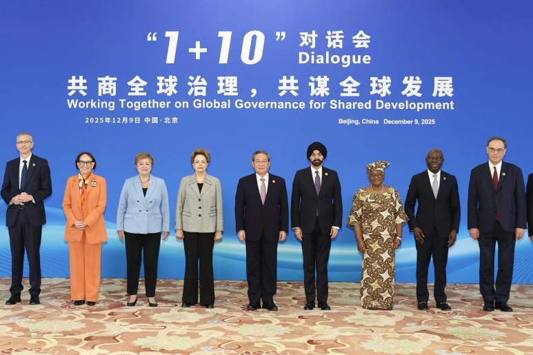 Chinese Premier Li Qiang holds the "1+10" Dialogue with heads of major international economic organizations at the Diaoyutai State Guesthouse in Beijing, capital of China, Dec. 9, 2025. The heads of major international economic organizations present at the dialogue were President of the New Development Bank Dilma Rousseff, President of the World Bank Ajay Banga, Managing Director of the International Monetary Fund Kristalina Georgieva, Director-General of the World Trade Organization Ngozi Okonjo-Iweala, Secretary-General of the UN Conference on Trade and Development Rebeca Grynspan, Director-General of the International Labour Organization Gilbert F. Houngbo, General Manager of the Bank for International Settlements Pablo Hernandez de Cos, Chair of the Financial Stability Board Andrew Bailey, President of the Asian Infrastructure Investment Bank Jin Liqun, and Deputy Secretary-General of the Organization for Economic Co-operation and Development Frantisek Ruzicka. (Xinhua/Huang Jingwen)