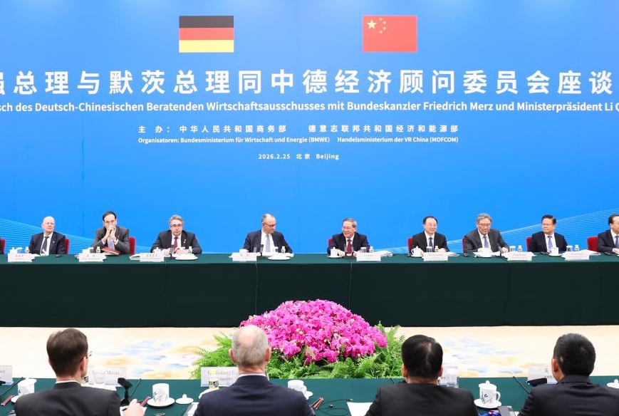 Chinese Premier Li Qiang and German Chancellor Friedrich Merz attend a symposium of the China-Germany economic advisory committee at the Great Hall of the People in Beijing, capital of China, Feb. 25, 2026. (Xinhua/Huang Jingwen)
