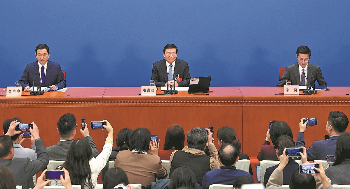 Lou Qinjian (center), spokesman for the fourth session of the 14th National People's Congress, China's top legislature, takes questions on Wednesday from Chinese and foreign journalists about the agenda of the annual legislative session and the work of the NPC, at the Great Hall of the People in Beijing. WANG ZHUANGFEI/CHINA DAILY