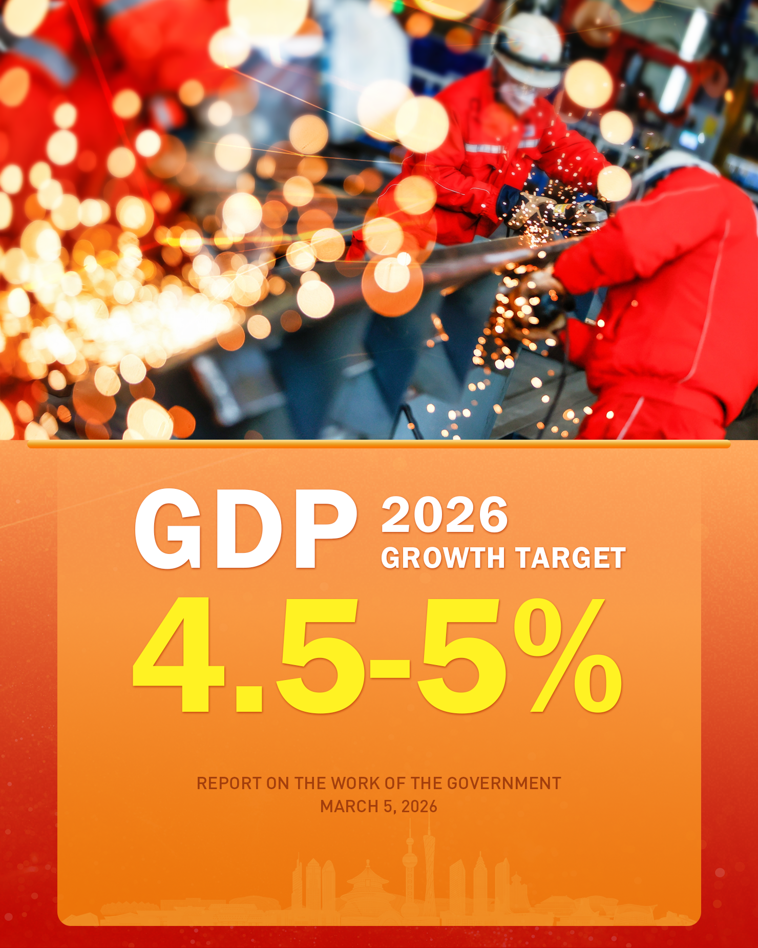 China sets its annual economic growth goal at a range of 4.5% to 5% in 2026 and will strive for better in practice, according to a government work report submitted Thursday to the national legislature for deliberation.