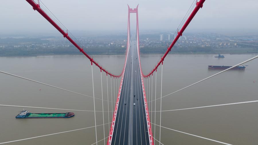 China's first double-deck cable-stayed suspension bridge opens to traffic over Yangtze River