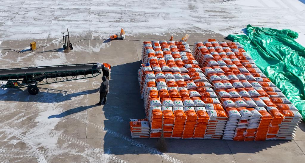 An aerial drone photo taken on Feb. 28, 2026 shows staff members packing paddy rice seeds at Youyi Farm Co., Ltd. under Beidahuang Group in Shuangyashan City, northeast China's Heilongjiang Province. (Xinhua/Wang Song)