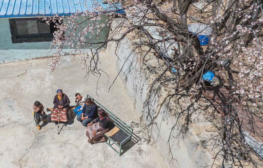 An aerial drone photo taken on March 26, 2026 shows Tsering Sangmo (2nd L) and her family members sitting in the yard in Zongkhar Village of Shannan City, southwest China's Xizang Autonomous Region. (Xinhua/Tenzin Nyida)