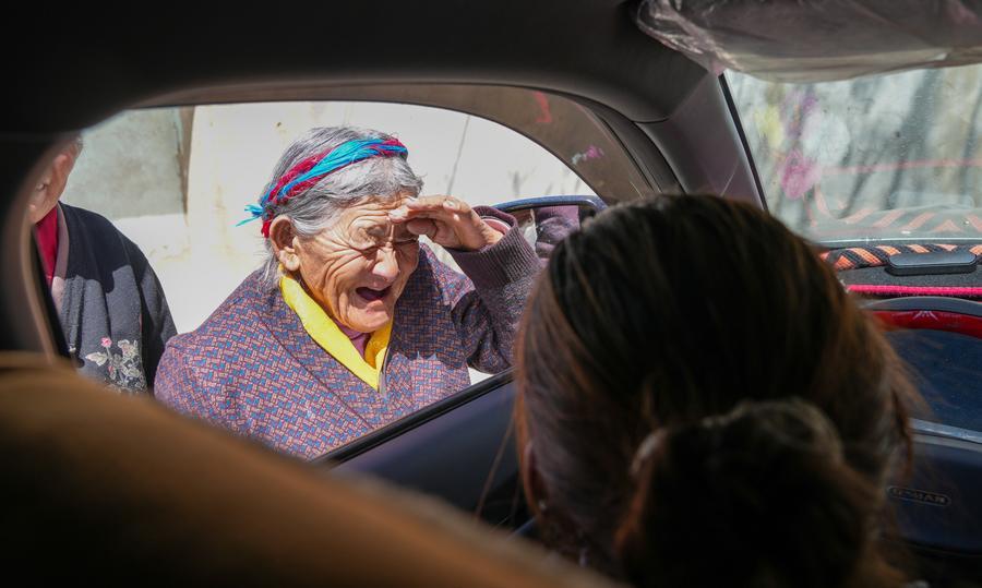 Tsering Sangmo sees her family members off in Zongkhar Village of Shannan City, southwest China's Xizang Autonomous Region, March 26, 2026. (Xinhua/Jigme Dorje)