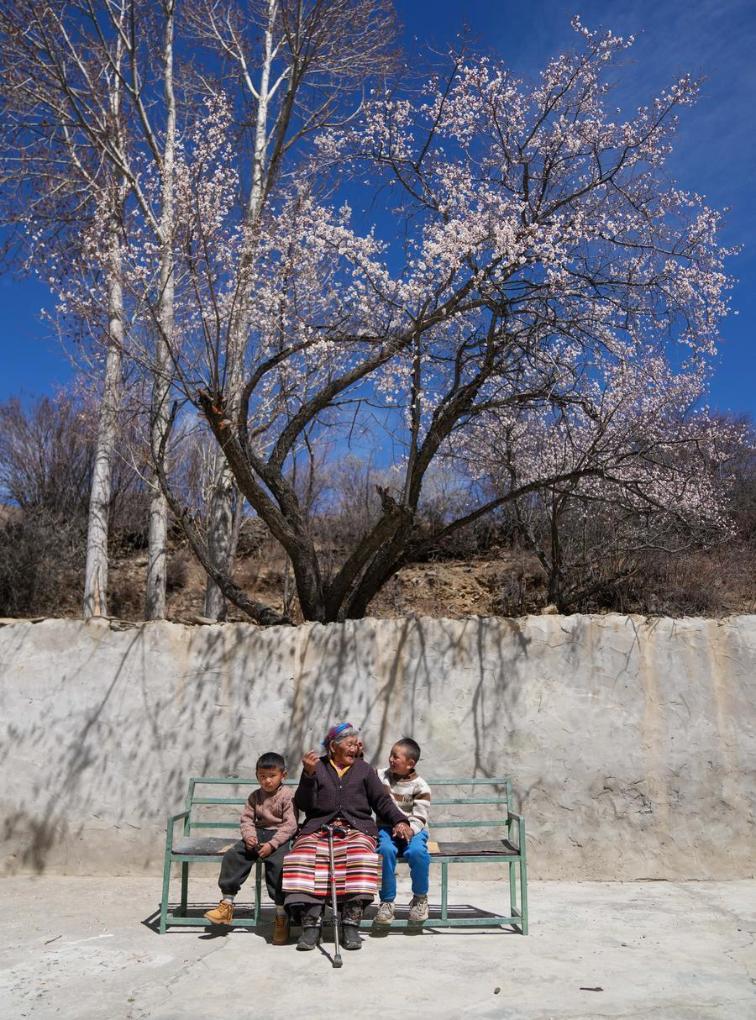 Tsering Sangmo (C) and her great-grandsons sit in her yard in Zongkhar Village of Shannan City, southwest China's Xizang Autonomous Region, March 26, 2026. (Xinhua/Jigme Dorje)