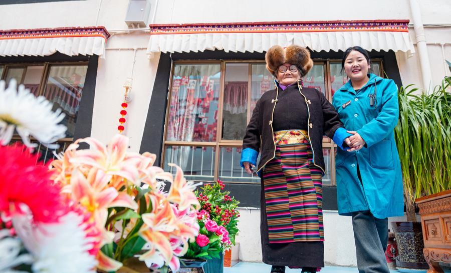 Tsedekyi (L) is pictured with a staff member at a care center in Sangri County of Shannan City, southwest China's Xizang Autonomous Region, March 25, 2026. (Xinhua/Tenzin Nyida)