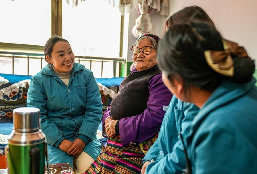 Tsedekyi (2nd L) talks with staff members at a care center in Sangri County of Shannan City, southwest China's Xizang Autonomous Region, March 25, 2026. (Xinhua/Jigme Dorje)