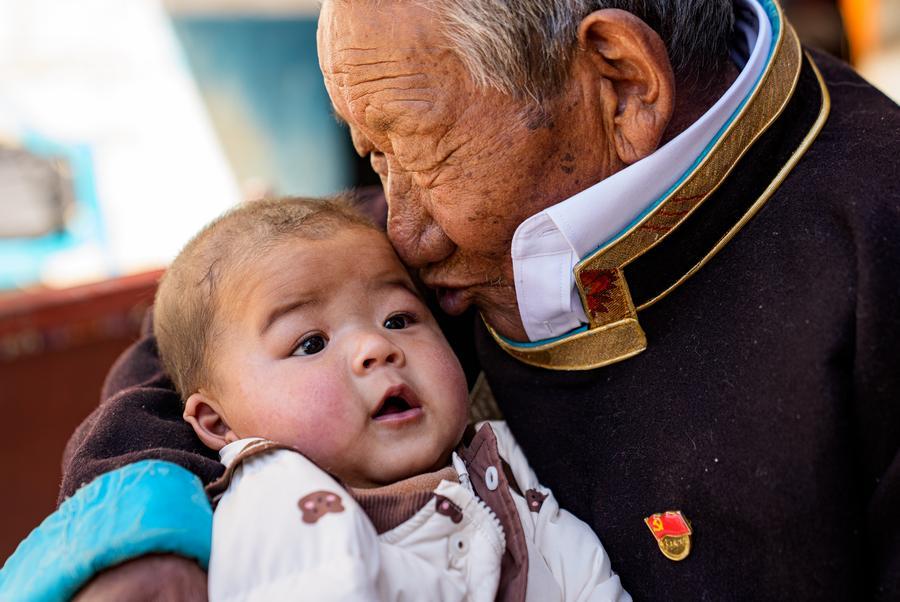 Tsering Samdrup kisses his great-grandson at home in Samyai Town of Shannan, southwest China's Xizang Autonomous Region, March 25, 2026. (Xinhua/Tenzin Nyida)