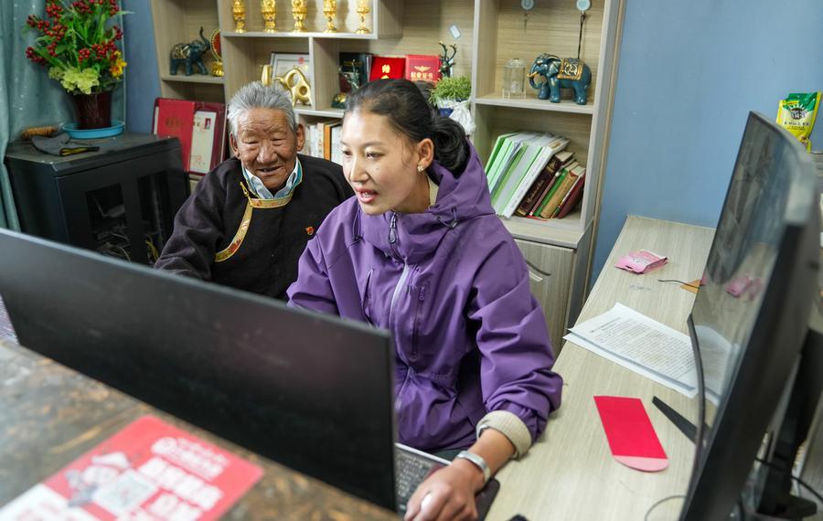 Tsering Samdrup (L) and his granddaughter check hotel occupancy rate in Samyai Town of Shannan, southwest China's Xizang Autonomous Region, March 25, 2026. (Xinhua/Jigme Dorje)