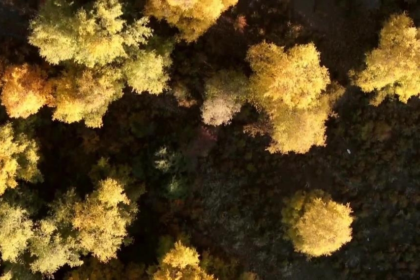In late autumn, dawn redwoods at a wetland park on Dianchi Lake's southern shore glow in brilliant shades of red and gold. Reflected in the lake's clear blue waters, the scene looks like a living watercolor painting.
