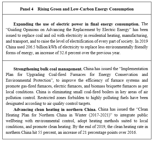 Focusing on the Beijing-Tianjin-Hebei region and its surrounding areas, the Yangtze River Delta, the Pearl River Delta and the Fenwei Plain (the Fenhe Plain, the Weihe Plain and their surroundings in the Yellow River Basin), China is working to reduce and find substitutes for coal consumption, and taking comprehensive measures to control the use of bulk coal. It is promoting clean and efficient coal-fired furnaces, and replacing inefficient and highly-polluting coal with natural gas, electricity and renewable energy. Now, fiscal and price policies are in place to support clean heating in winter in northern China to improve air quality. China is replacing coal and oil with electricity in final energy consumption, and popularizing new energy vehicles, heat pumps, electric furnaces, and other new forms of energy consumption. It has strengthened the development and connectivity of natural gas infrastructure, and made the use of natural gas more efficient in urban areas, as well as in industrial fuel, power generation, and transport. It is promoting natural gas CCHP (combined cooling heating and power), decentralized renewable energy, and multi-energy coordination and energy cascade use in final energy consumption.