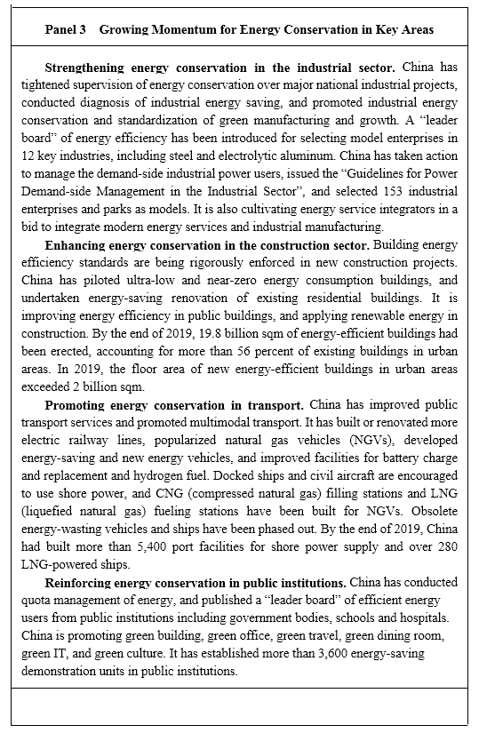 China has revised the Energy Conservation Law. It has put in place an energy-saving system in key areas including industry, construction and transport as well as in public institutions. It continues to improve the supporting legal institutions for energy conservation supervision, energy-efficiency labeling, energy-saving checks on fixed assets investment projects, and energy conservation management of key energy consumers. It has strengthened standard-setting as a constraining factor and improved energy-saving standards system. It has carried out 100 projects to upgrade energy efficiency standards, enacted more than 340 national energy-saving standards, including almost 200 mandatory standards, covering most high energy-consuming industries and final energy consumption products. China has strengthened oversight over energy-saving law enforcement, reinforced operational and post-operational supervision, and exercised strict accountability for law enforcement to ensure the effective implementation of energy conservation laws, regulations, and mandatory standards.