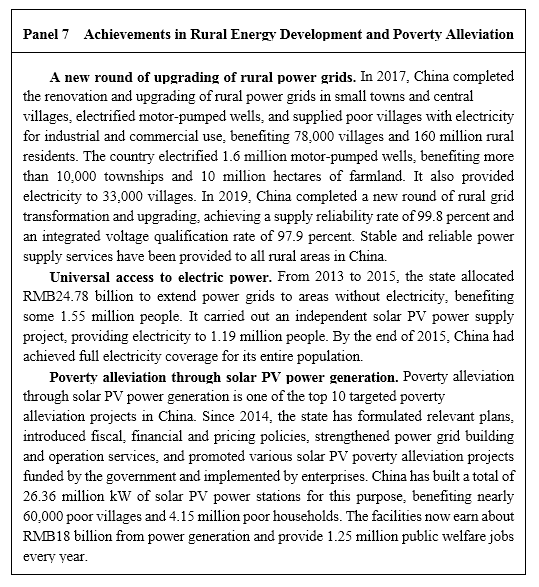 Improving rural energy infrastructure. Making electricity accessible to all is a basic condition for building a moderately prosperous society in all respects. China implemented a three-year action plan to ensure power access for people without electricity, and had achieved this goal by the end of 2015. China attaches great importance to the renovation and upgrading of the rural power grid and makes great efforts to strengthen the weak links in the process. It has carried out targeted programs for renovating and upgrading power grid in small towns and central villages2, connecting motor-pumped wells in rural plain areas to the grid, and supplying poor villages with electricity for industrial and commercial use. Since 2018, it has been focusing on upgrading the power grid in severely impoverished areas and border villages. China has built natural gas branch pipelines and infrastructure to expand the coverage of the pipeline network. To improve energy infrastructure in rural areas, it has built supply outlets for liquefied natural gas, compressed natural gas, and liquefied petroleum gas in areas not covered by natural gas pipelines, and developed renewable energy sources adapted to local conditions.