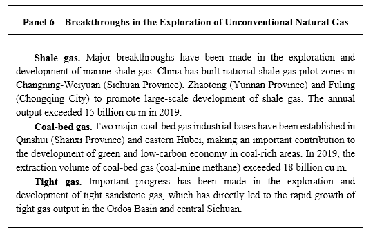 Increasing the production of natural gas. In order to increase domestic natural gas supply, China has strengthened basic geological surveying and resource evaluation, and stepped up scientific and technological innovation and industrial support for conventional natural gas production. It is also making breakthroughs in unconventional natural gas exploration and development, such as shale gas and coal-bed gas, and is working on large-scale shale gas exploitation. It is improving relevant policies for the exploitation and utilization of unconventional natural gas. Focusing on the Sichuan, Ordos and Tarim basins, it has built a number of natural gas production bases with an output of more than 10 billion cu m. Since 2017, natural gas output has been increasing by more than 10 billion cum per year.
