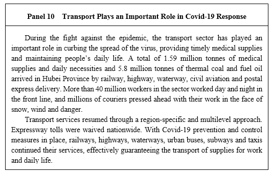 Upholding the sanctity of human life, China has improved the capacity of the transport industry to deal with public emergencies and in particular major public health emergencies, strengthened safety management and emergency response, and coordinated development and safety, so as to provide safe transport to the public and support economic and social development.