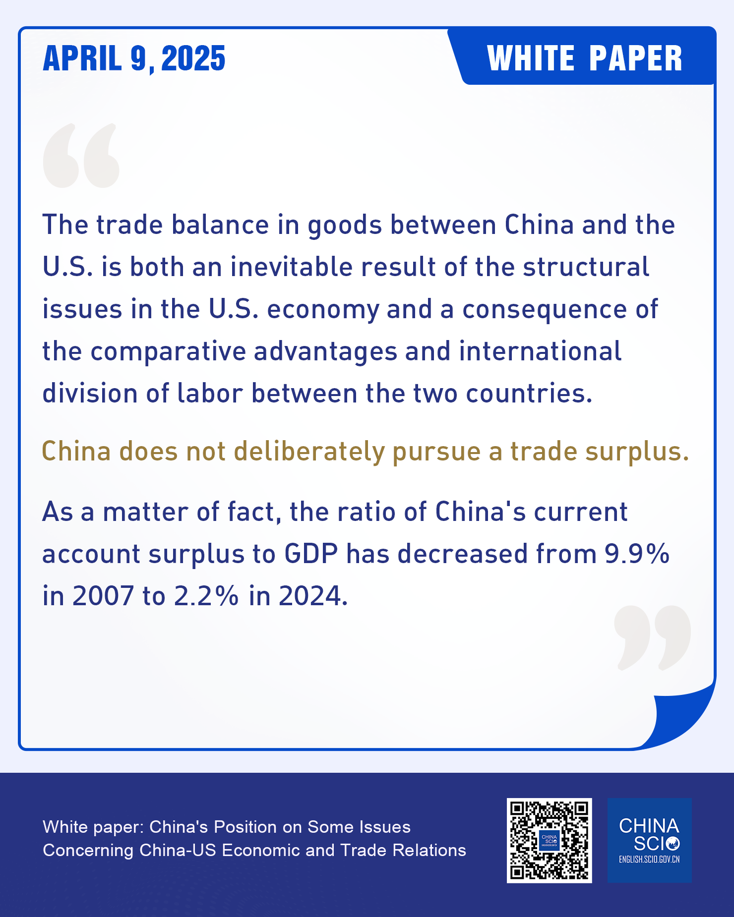 China on Wednesday issued a white paper elaborating its position on China-U.S. economic relations amid ongoing trade tensions, noting that it never deliberately pursues trade surplus. The ratio of China's current account surplus to GDP decreased from 9.9% in 2007 to 2.2% in 2024.
