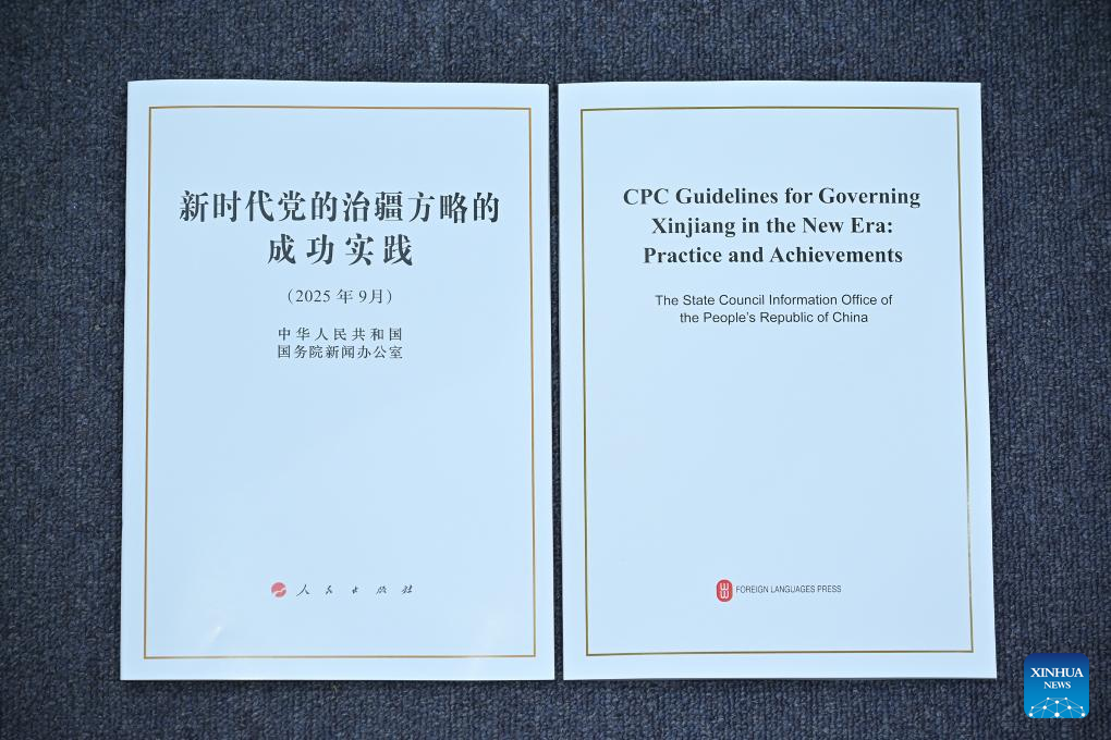 This photo taken on Sept. 19, 2025 shows copies of the white paper titled "CPC Guidelines for Governing Xinjiang in the New Era: Practice and Achievements" released by the State Council Information Office (SCIO). (Xinhua/Li Xin)