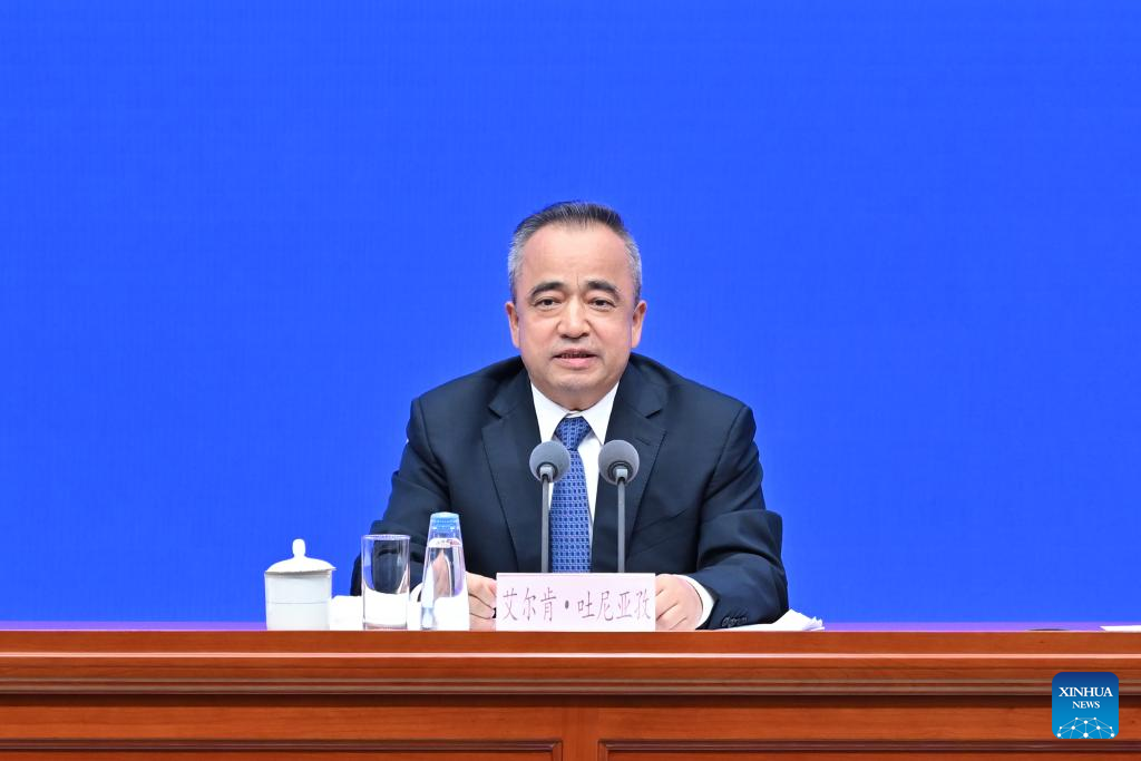 Erkin Tuniyaz, chairman of the regional government of Xinjiang, speaks at a press conference held by the State Council Information Office (SCIO) on the white paper titled "CPC Guidelines for Governing Xinjiang in the New Era: Practice and Achievements" in Beijing, capital of China, Sept. 19, 2025. (Xinhua/Li Xin)