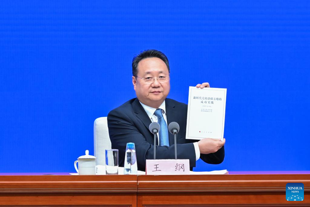 Wang Gang, deputy head of the Publicity Department of the Communist Party of China (CPC) Central Committee, shows a copy of the white paper titled "CPC Guidelines for Governing Xinjiang in the New Era: Practice and Achievements" during a press conference held by the State Council Information Office (SCIO) in Beijing, capital of China, Sept. 19, 2025. (Xinhua/Li Xin)