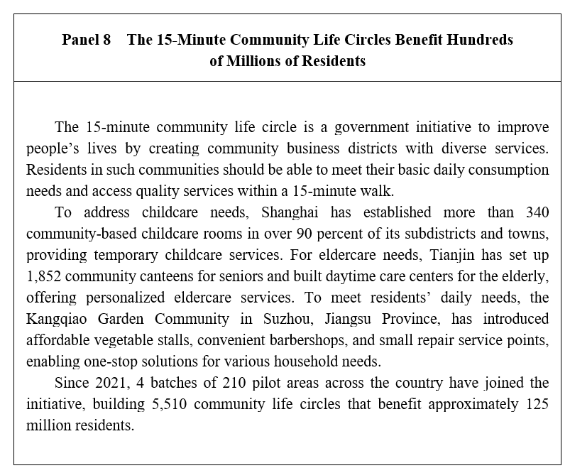 The domestic service sector continues to improve in quality and expand in scale. By the end of 2023, there were approximately 600,000 domestic service entities and 16,000 women-led domestic service community stations. National domestic service vocational skills competitions have been held to encourage skill enhancement among people working in this sector, provide a growth platform for more of them, and deliver high-quality services to families.