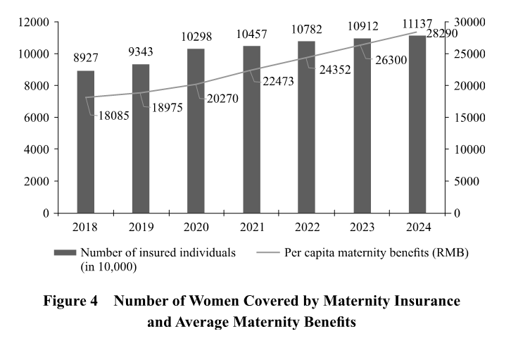 Maternity protection for women has improved significantly. The integrated implementation of maternity insurance and basic medical insurance for employees has been fully advanced, and continuous efforts have been made to expand employer participation in maternity insurance and to gradually extend its coverage. Regions with the necessary conditions have been guided to include flexibly employed people in maternity insurance. For unemployed women, the unemployment insurance fund pay their maternity insurance contributions on their behalf during their period of unemployment benefit eligibility, while non-working women are covered for maternity medical benefits through their participation in the basic medical insurance scheme for rural and non-working urban residents. By the end of 2024, 111 million women were covered by maternity insurance. All 31 provinces, autonomous regions, and municipalities directly under the central government, as well as the Xinjiang Production and Construction Corps, have included eligible assisted reproductive technologies (ART) in their medical insurance schemes.
