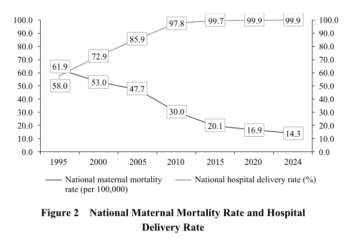 Since 2012, the national hospital delivery rate has remained above 99 percent, and in 2024, the systematic maternal management rate reached 94.9 percent. The maternal mortality rate has dropped by 76.9 percent, from 61.9 per 100,000 in 1995 to 14.3 per 100,000 in 2024 - far below the global average.