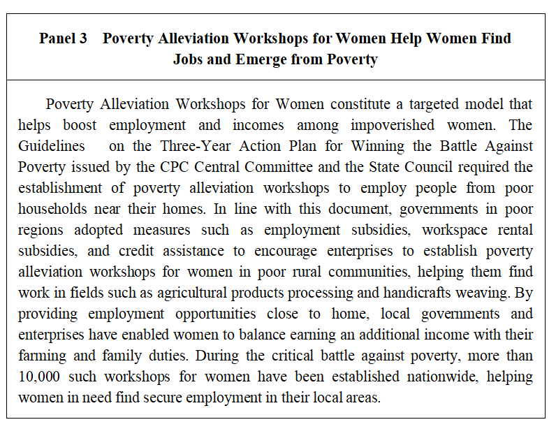 After winning the battle against absolute poverty, the country initiated a five-year transition period during which poverty alleviation support policies remained in effect to buttress areas and populations that had recently emerged from poverty. Based on the stable operation of such policies, a robust dynamic monitoring and assistance mechanism has been established to prevent any relapse into or occurrence of poverty, and support remains in place for women lifted out of poverty and those in low-income areas to participate in the local economy, seek more employment opportunities, and increase incomes.