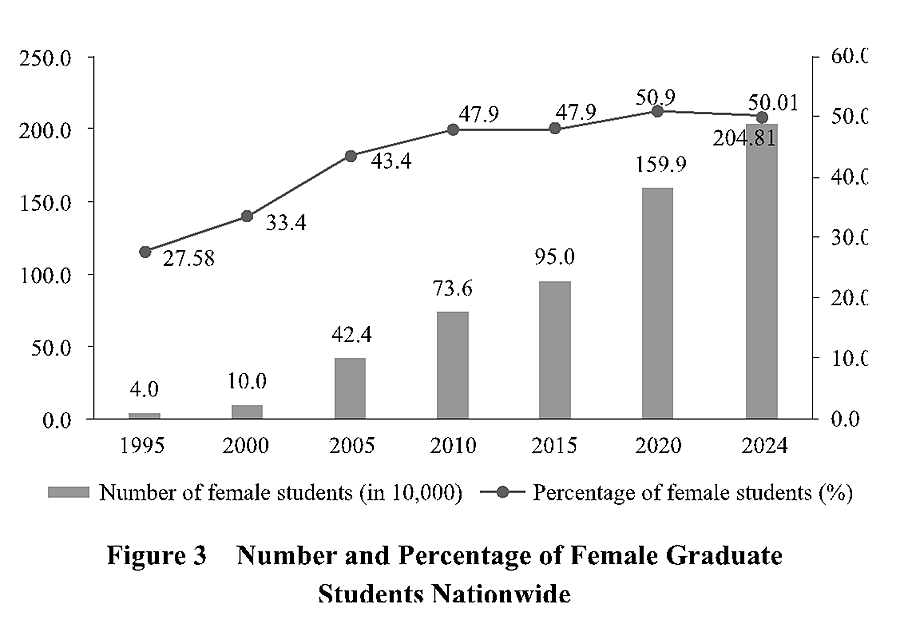 A rough balance between male and female students in higher education has been achieved. China has made sustained efforts to develop the world's largest higher education system, cement and advance accessibility in higher education, and ensure gender equality in the enrollment of regular institutions of higher learning. In 2024, female students in these institutions made up 50.76 percent of the total, 14.15 percentage points higher than in 1995. Among them, female graduate students accounted for 50.01 percent, an increase of 22.43 percentage points from 1995.